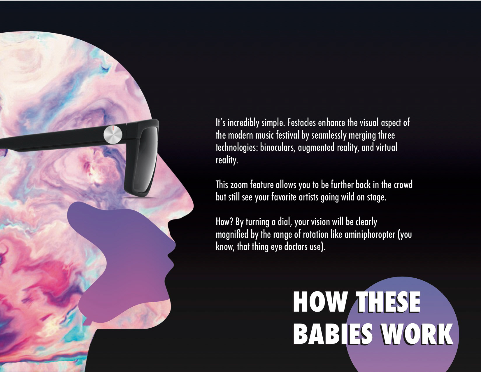 This project, titled Festacles, which is a blend of festival and spectacles, was born off of a creative contest idea. This goal was to rethink the way we view music festivals. This was our entry.